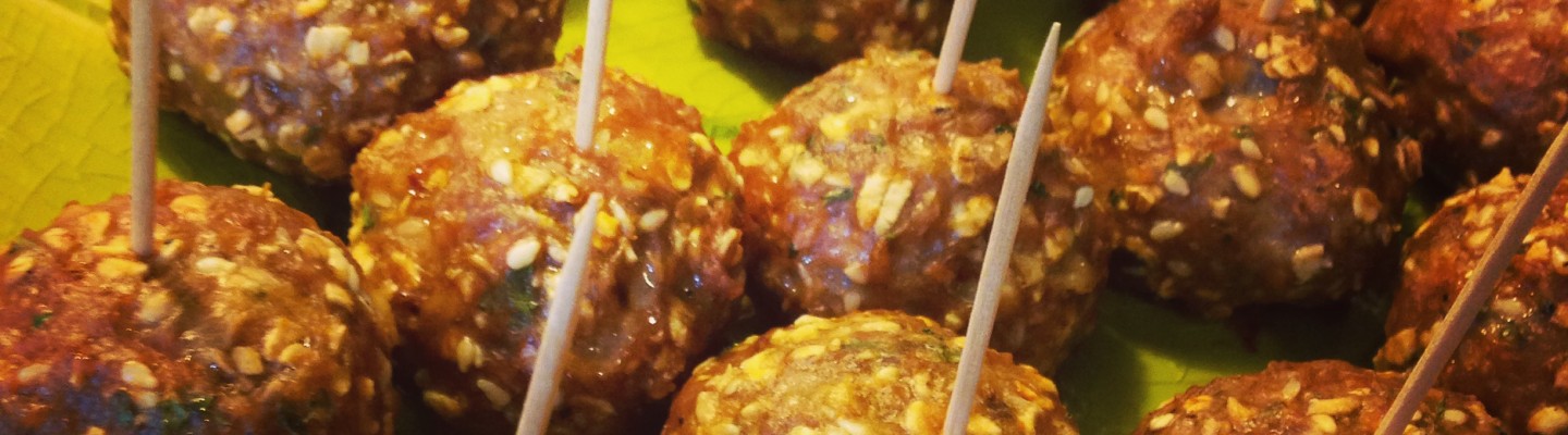 Serve the meatballs warm sprinkled with a bit of the reserved green onion with the dipping sauce on the side. I sprinkled a bit of sesame seeds over the sauce just before serving. Or serve each meatball in a Boston lettuce leaf cup with a bit of the dipping sauce drizzled on top and sprinkled with a bit more sesame seeds and finely sliced green onion.