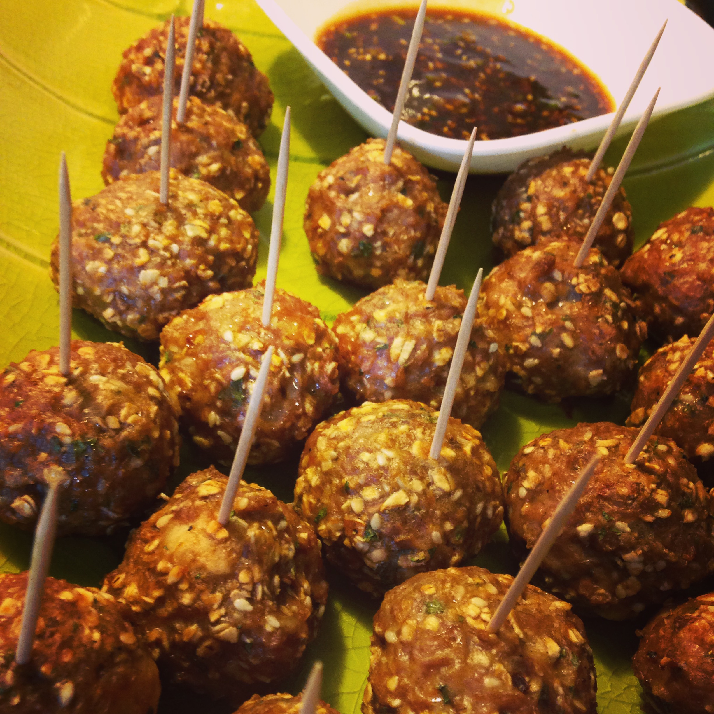 Serve the meatballs warm sprinkled with a bit of the reserved green onion with the dipping sauce on the side. I sprinkled a bit of sesame seeds over the sauce just before serving. Or serve each meatball in a Boston lettuce leaf cup with a bit of the dipping sauce drizzled on top and sprinkled with a bit more sesame seeds and finely sliced green onion.