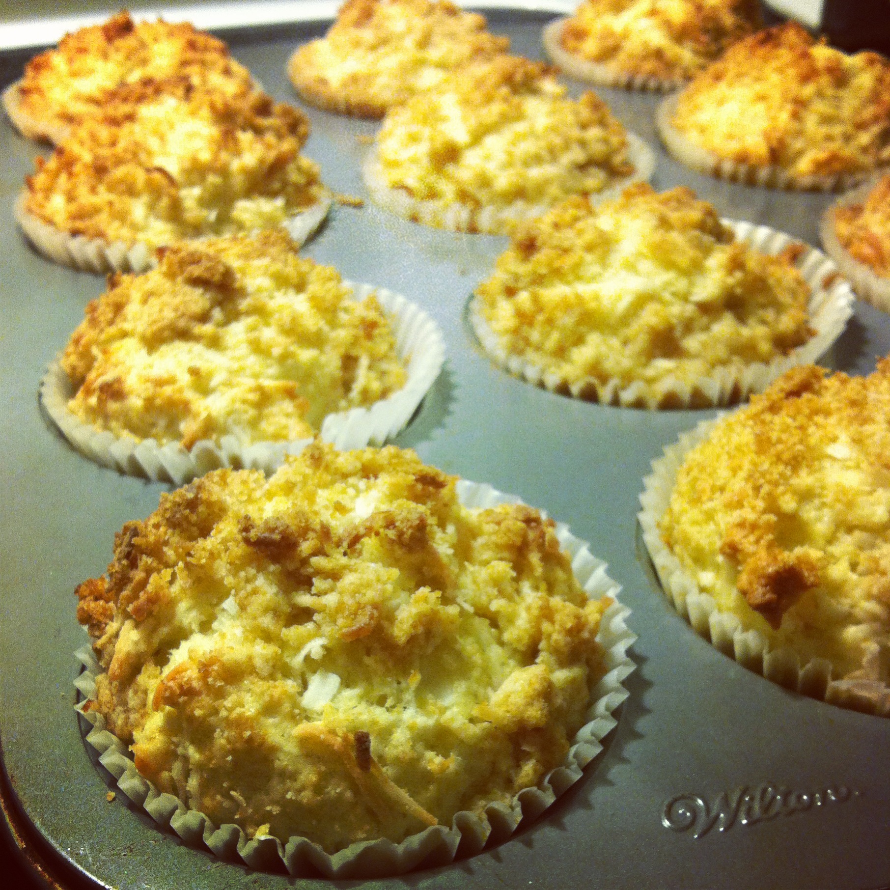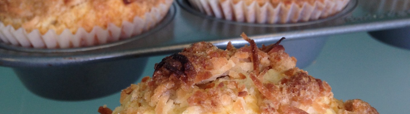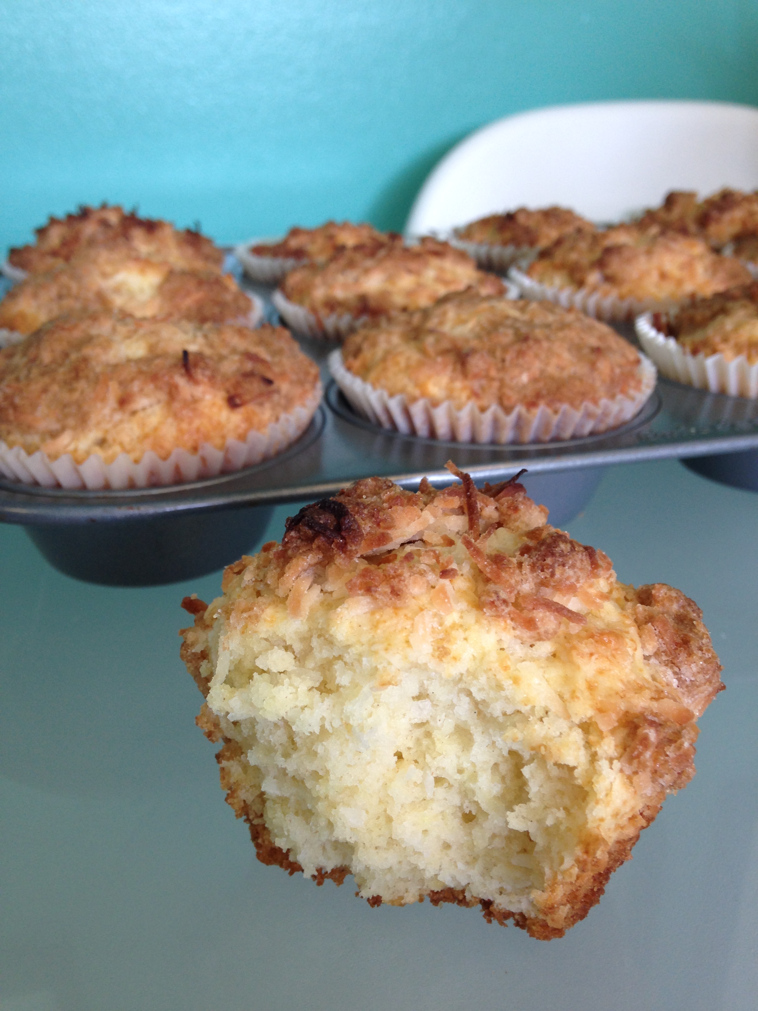 For the muffins: in a medium bowl, stir together the flour, coconut, sugar, baking powder and salt. Set aside.