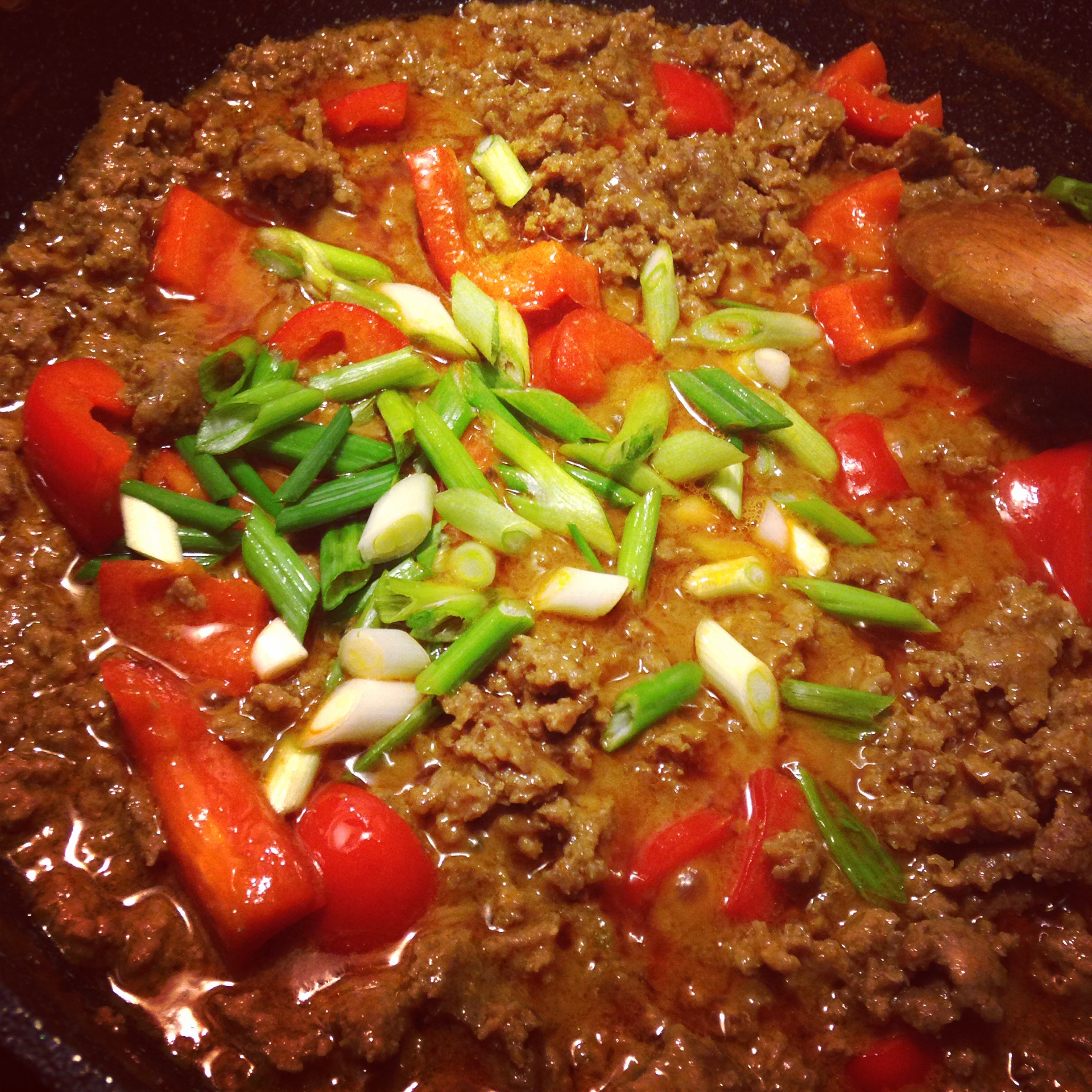In a large pan, brown the ground beef in the sesame oil. Drain off the excess fat. If you’re making the veggie version, cook the vegetables for a few minutes in the sesame oil.