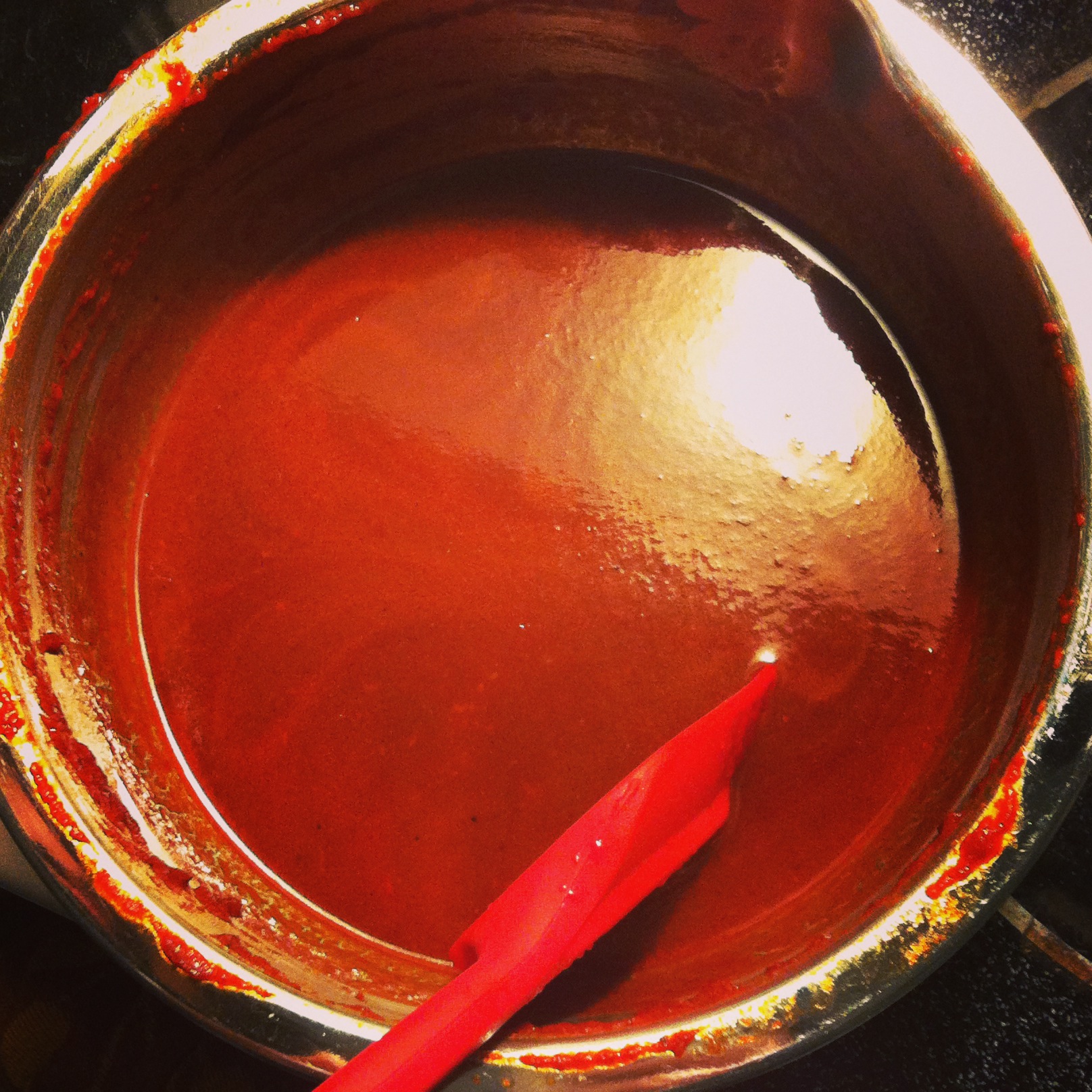 Heat 2 Tbsp vegetable oil in a large pot on med-high heat. Add the pepper purée. It should sizzle when it hits the pan. Whisk constantly to avoid it from splashing you and cook for about 8 mins. You know it’s done when it tastes a bit mellowed and less bitter from before it was cooked.