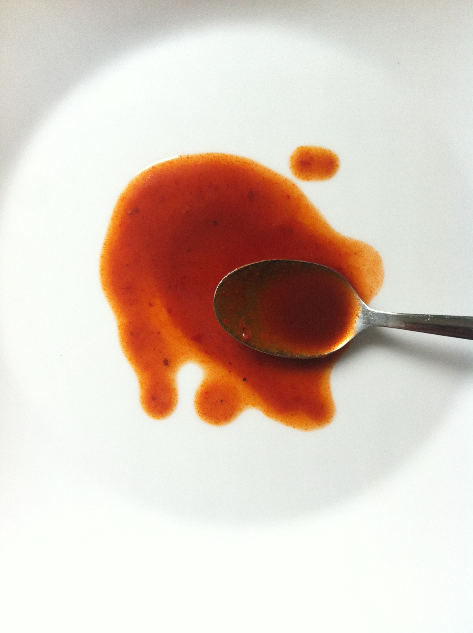 Strain the sauce into a bowl using a fine sieve. Be sure to press the pulp down with the back of a spoon to extract all of the pulp, but leave behind the tough skins. The dry pepper skins you will be discarding are pictured below. This is an important step because you will be left with a silky, smooth sauce that is ready to use. You can also store it in the fridge for about a week.
