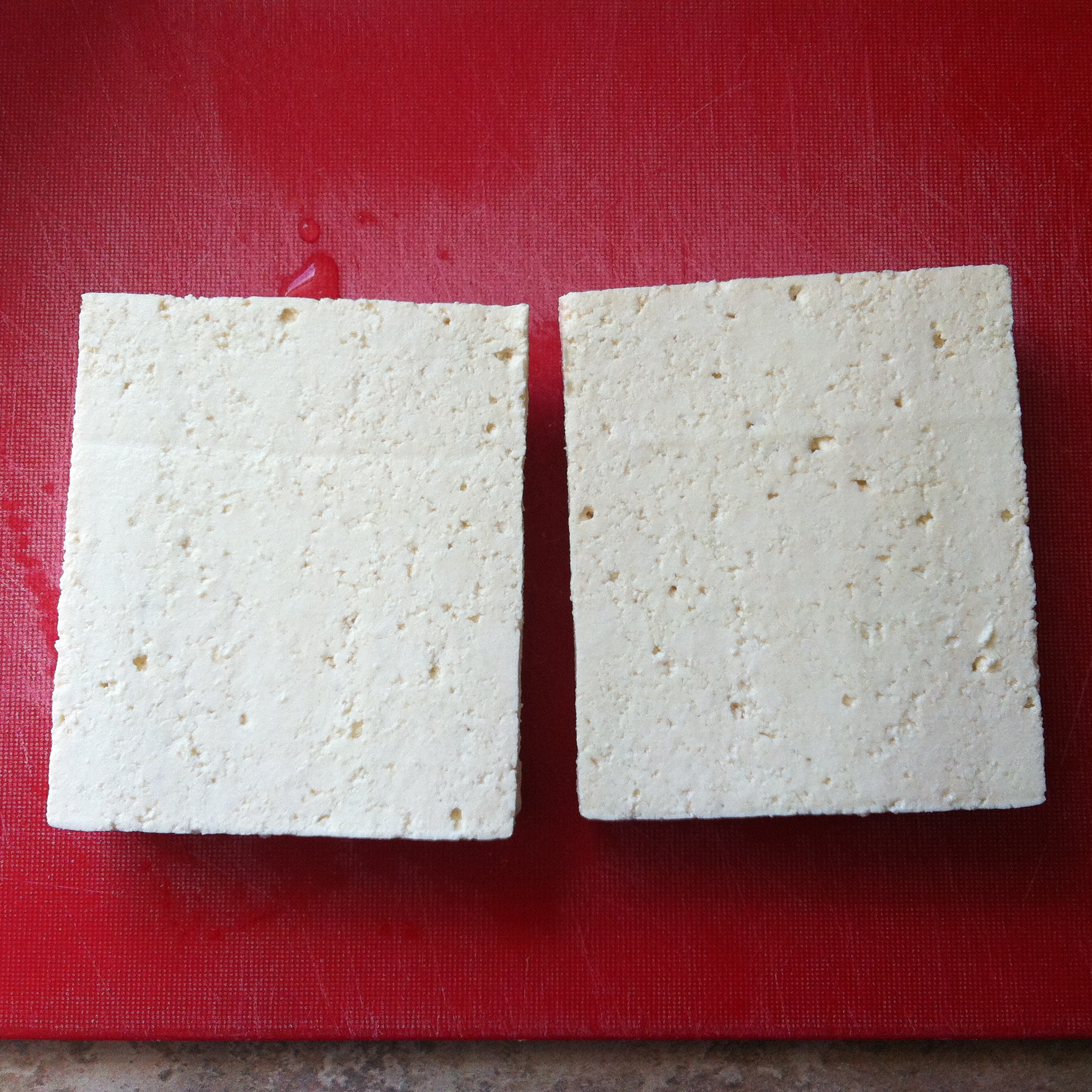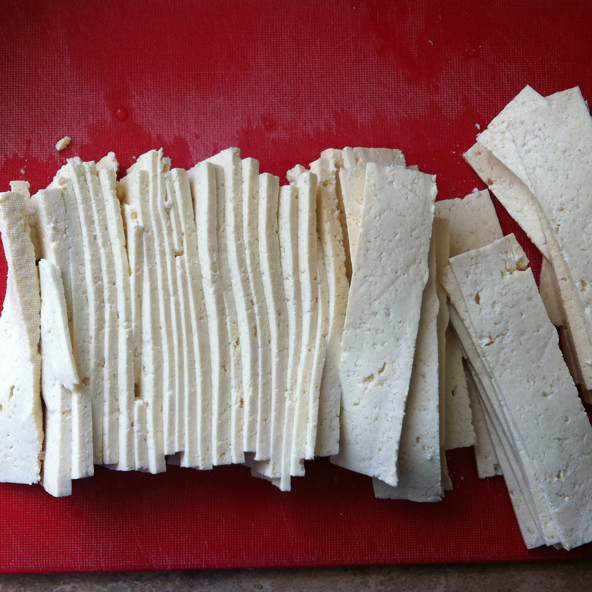 - 1 block of extra firm organic tofu, first sliced in half to make 2 shorter blocks and then each half sliced into 22-25 thin slices lengthwise (see pictures below)