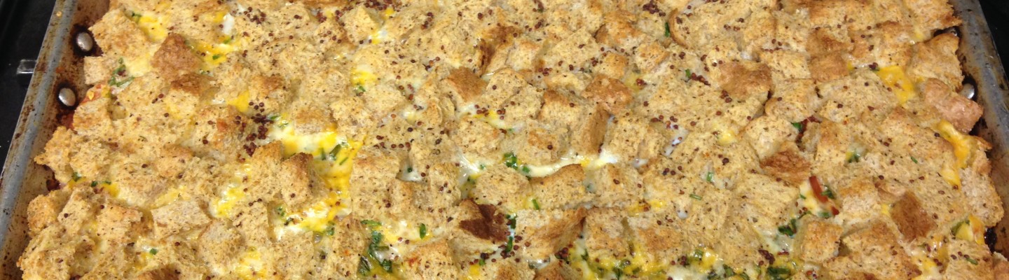 Before serving your baked strata, let it sit for about 10-15 minutes to set and then cut it into individual pieces. Serves 10-12.