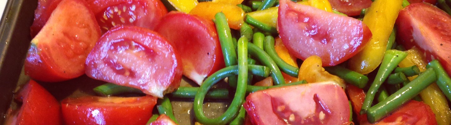 Place the garlic scapes, peppers and tomatoes on the baking sheet and drizzle with the olive oil, balsamic vinegar and some salt and pepper. Using your hands, mix the vegetables well to coat.