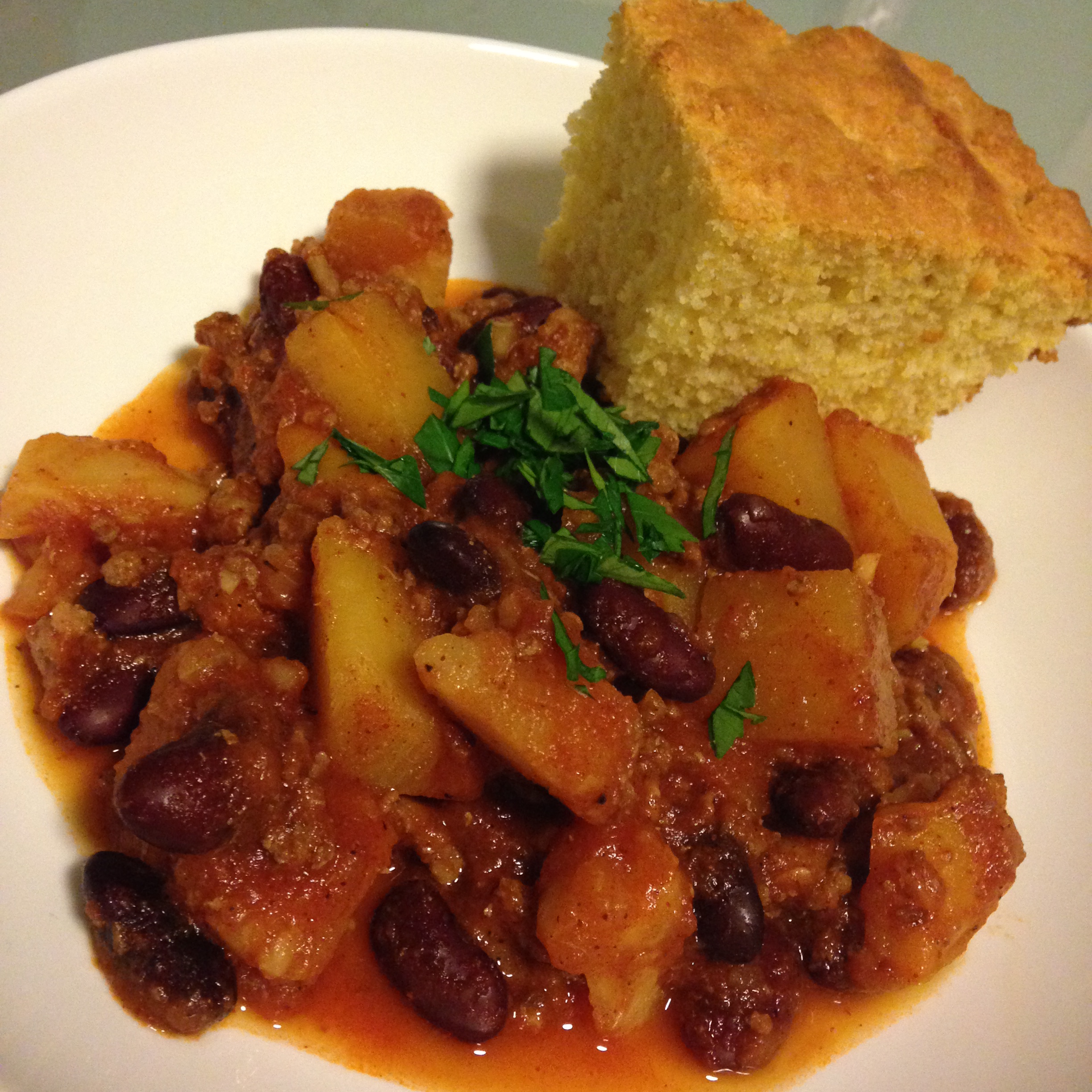 In a large pot over medium-high heat, brown the ground turkey in the olive oil. Add the onion and garlic and cook until softened a bit. Add the rest of the ingredients, except the kidney beans and garnish, and stir to combine. Bring the mixture to a boil, reduce heat and simmer partially covered for 1 hour (stirring occasionally). Add the kidney beans, partially cover and simmer for another 30 minutes (stirring occasionally). Add salt to taste. Serve over rice or with a side of fresh cornbread if you like with a bit of chopped parsley or green onion to garnish.